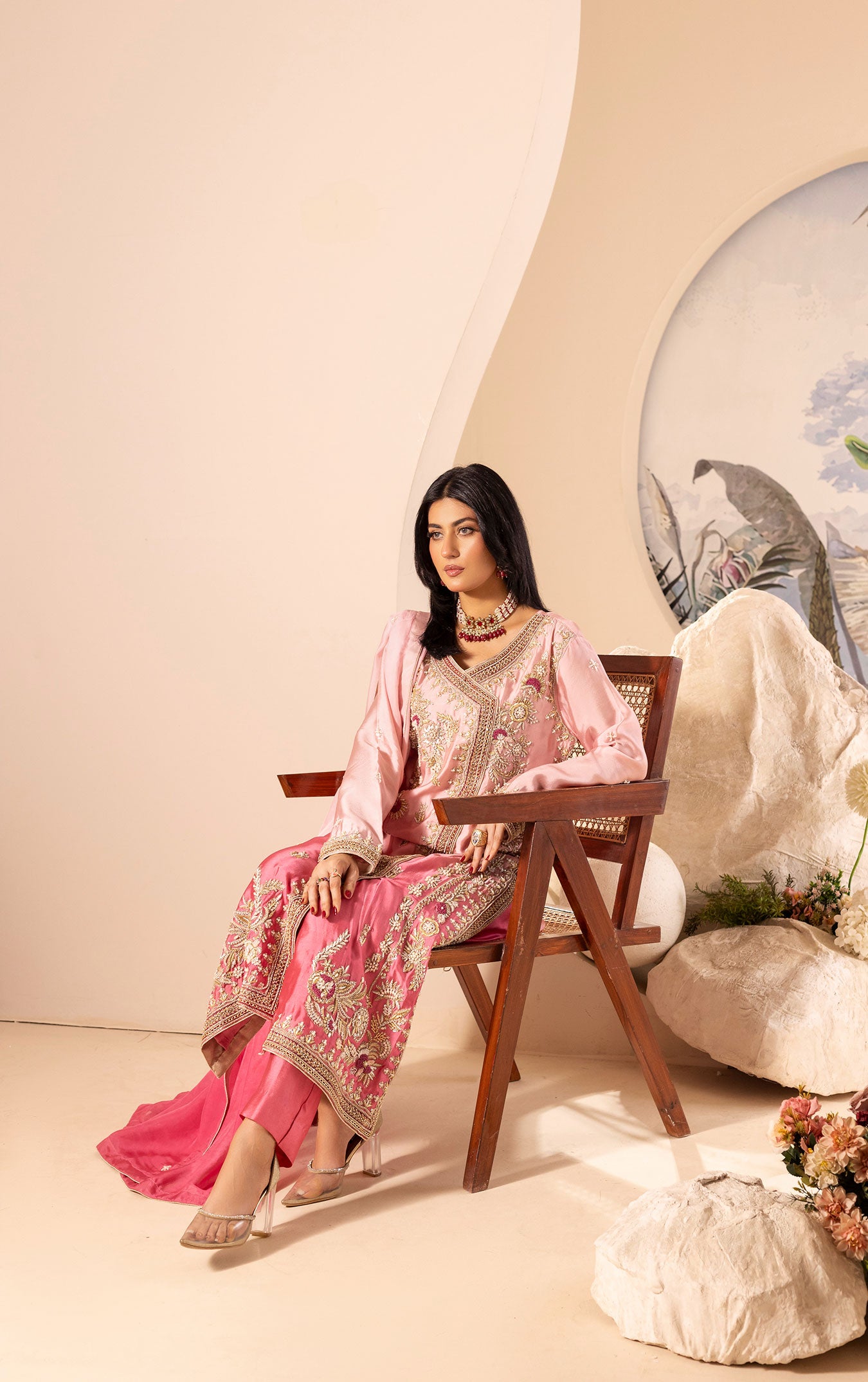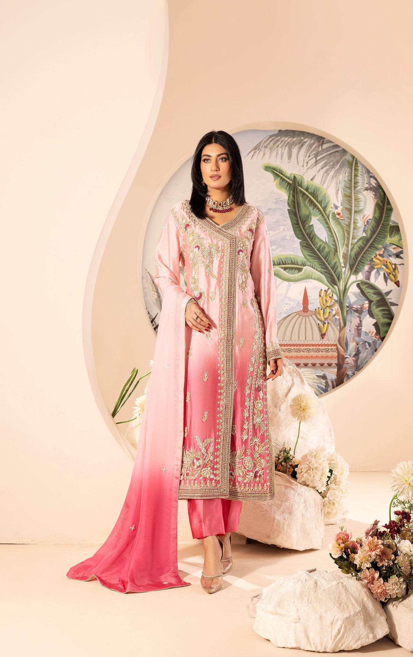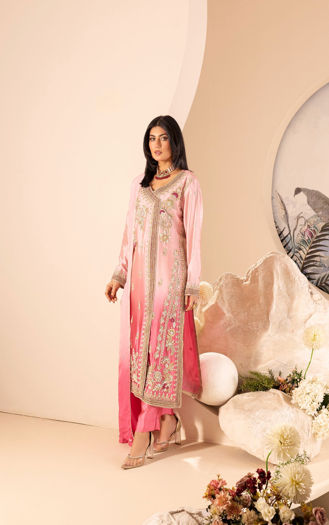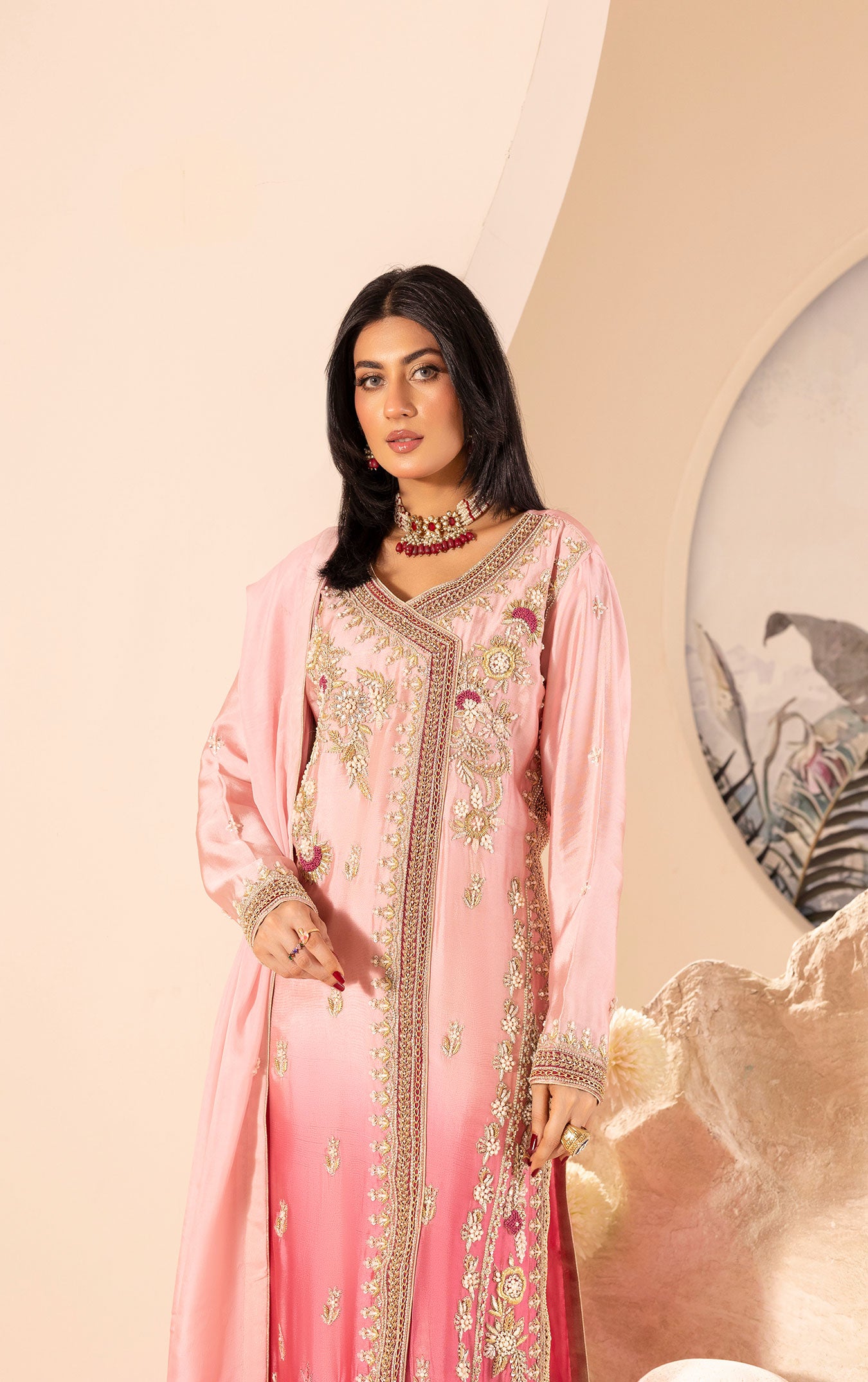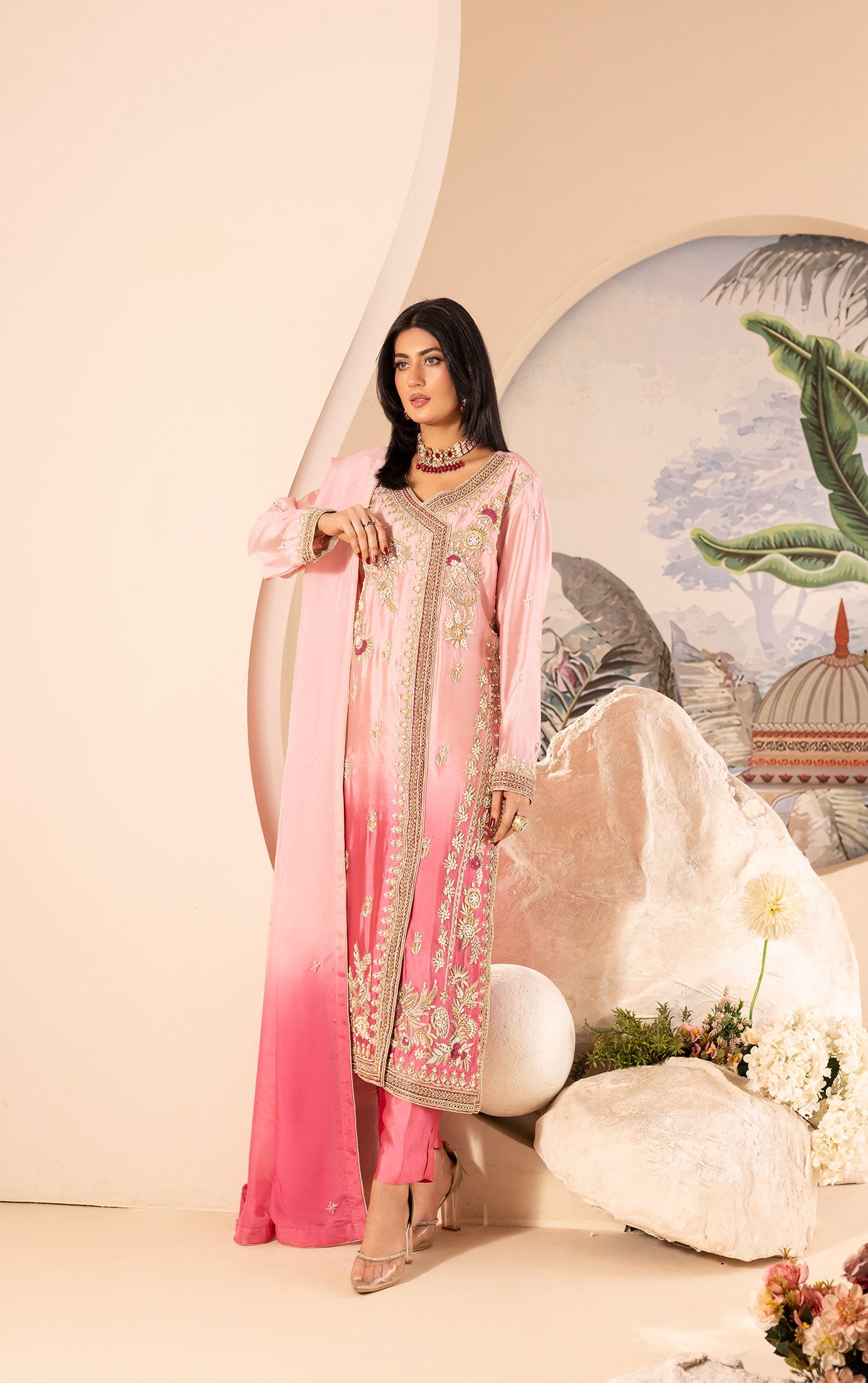 Introducing the "Gul-e-Bahisht," a captivating pink ensemble that exudes romantic charm and traditional grandeur. The long, flowing shirt features a beautiful gradient of pink hues, adorned with intricate golden embroidery that cascades elegantly down the front and sleeves. This vibrant and ornate attire, paired with matching trousers, is a perfect choice for festive occasions, embodying a lively spirit with classic Pakistani craftsmanship.