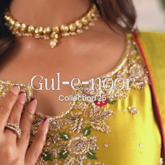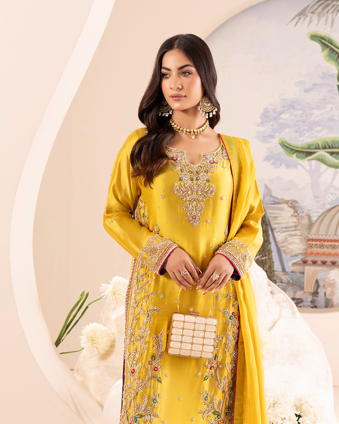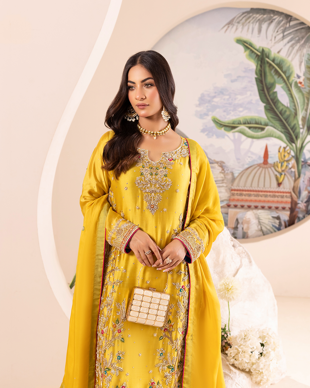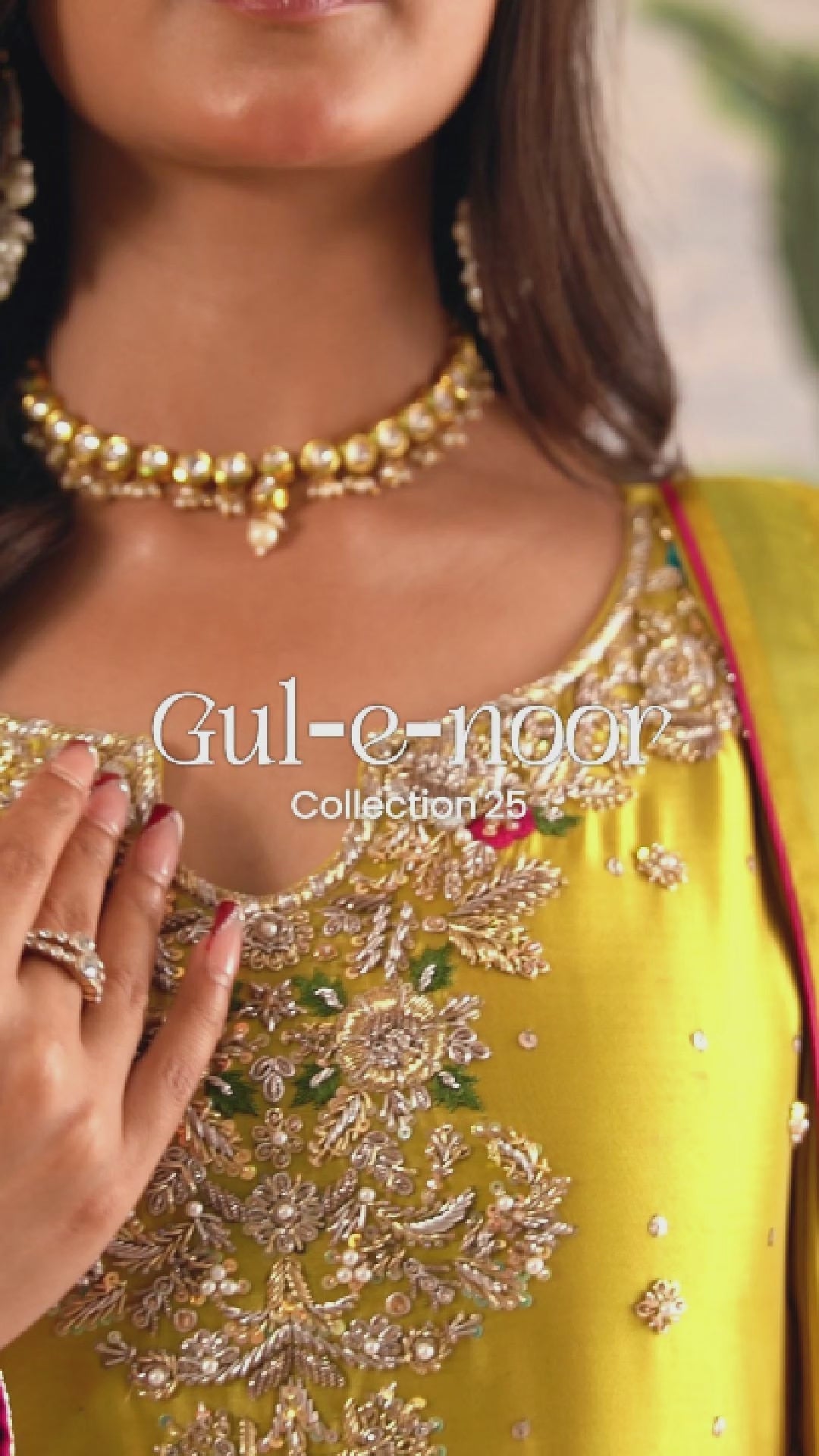A radiant mustard yellow ensemble, Gul-e-Noor is a celebration of timeless elegance and intricate craftsmanship. The silk shirt is adorned with delicate hand-embellished gold zari, crystal, and mirror work, with vibrant resham floral motifs blooming along the hem. Paired with sleek matching trousers and a richly embellished dupatta edged in colorful piping, this outfit blends traditional charm with festive sophistication, perfect for weddings and cultural celebrations.