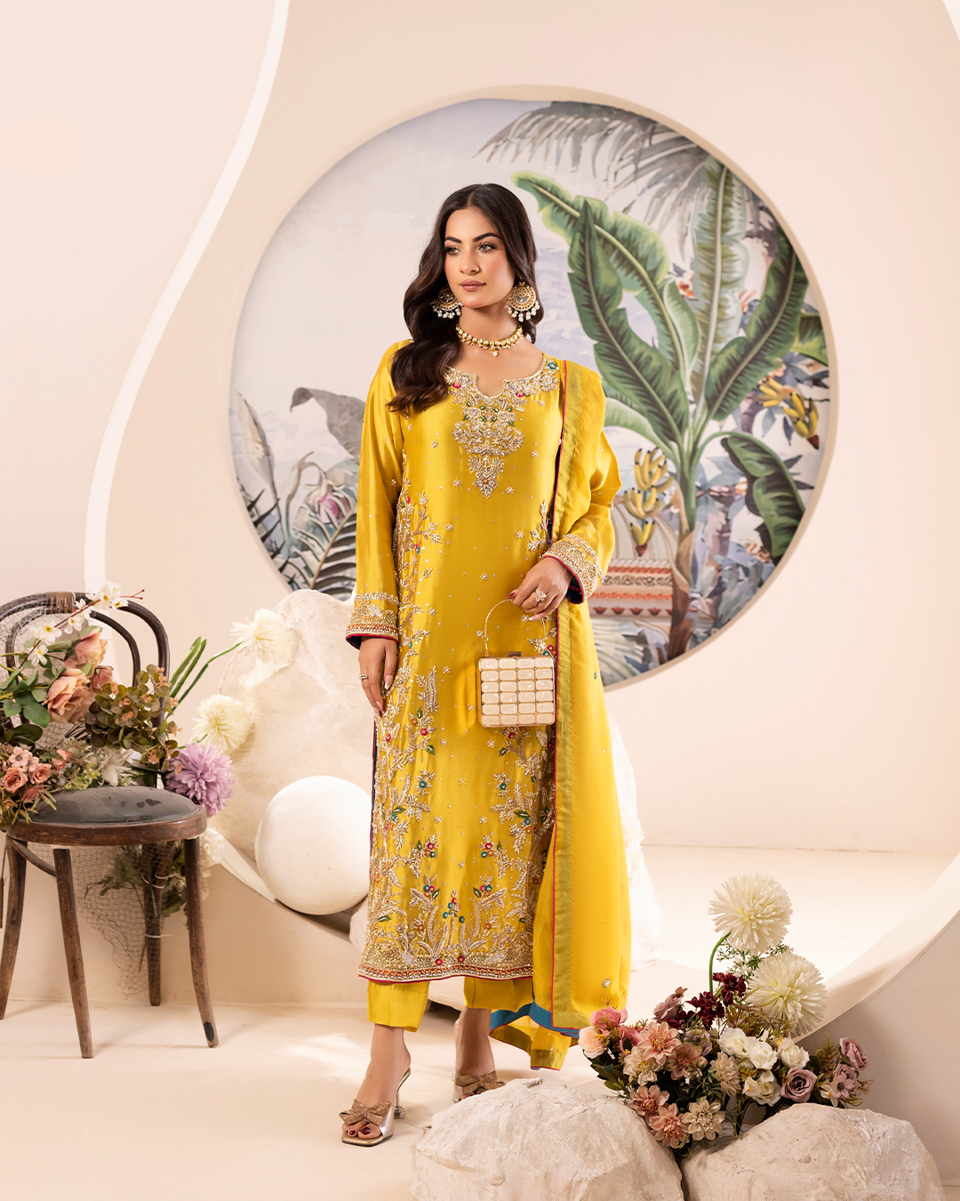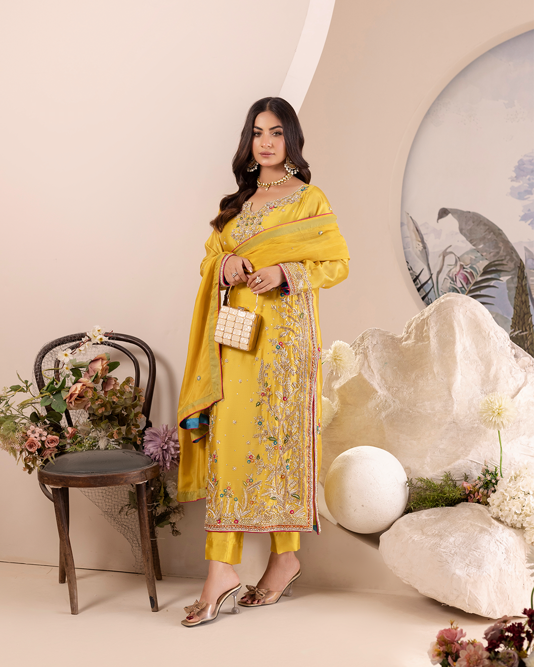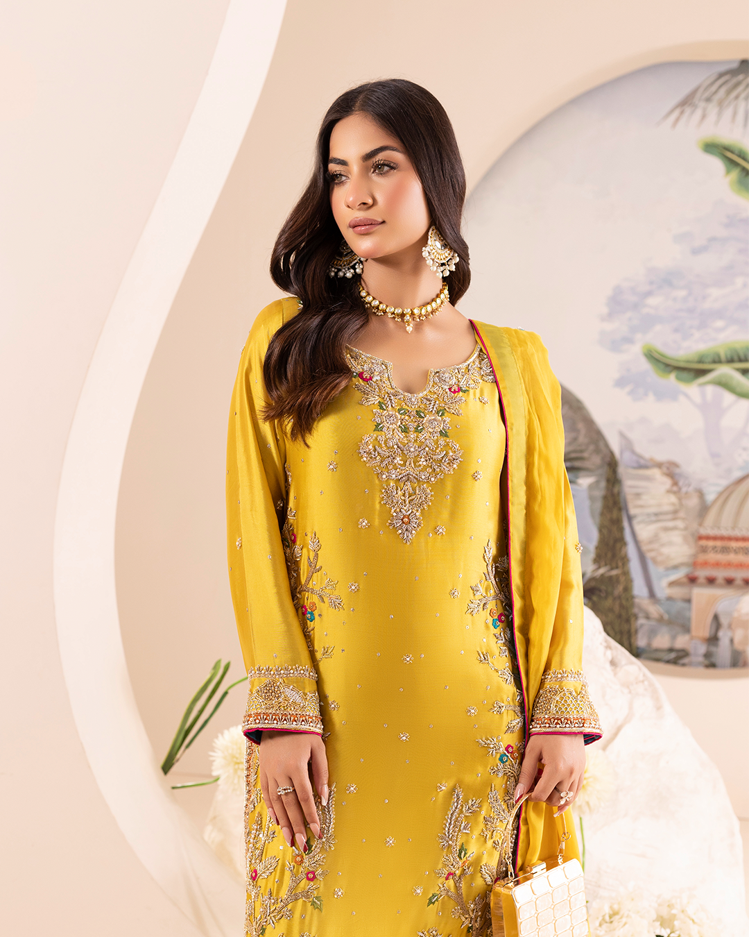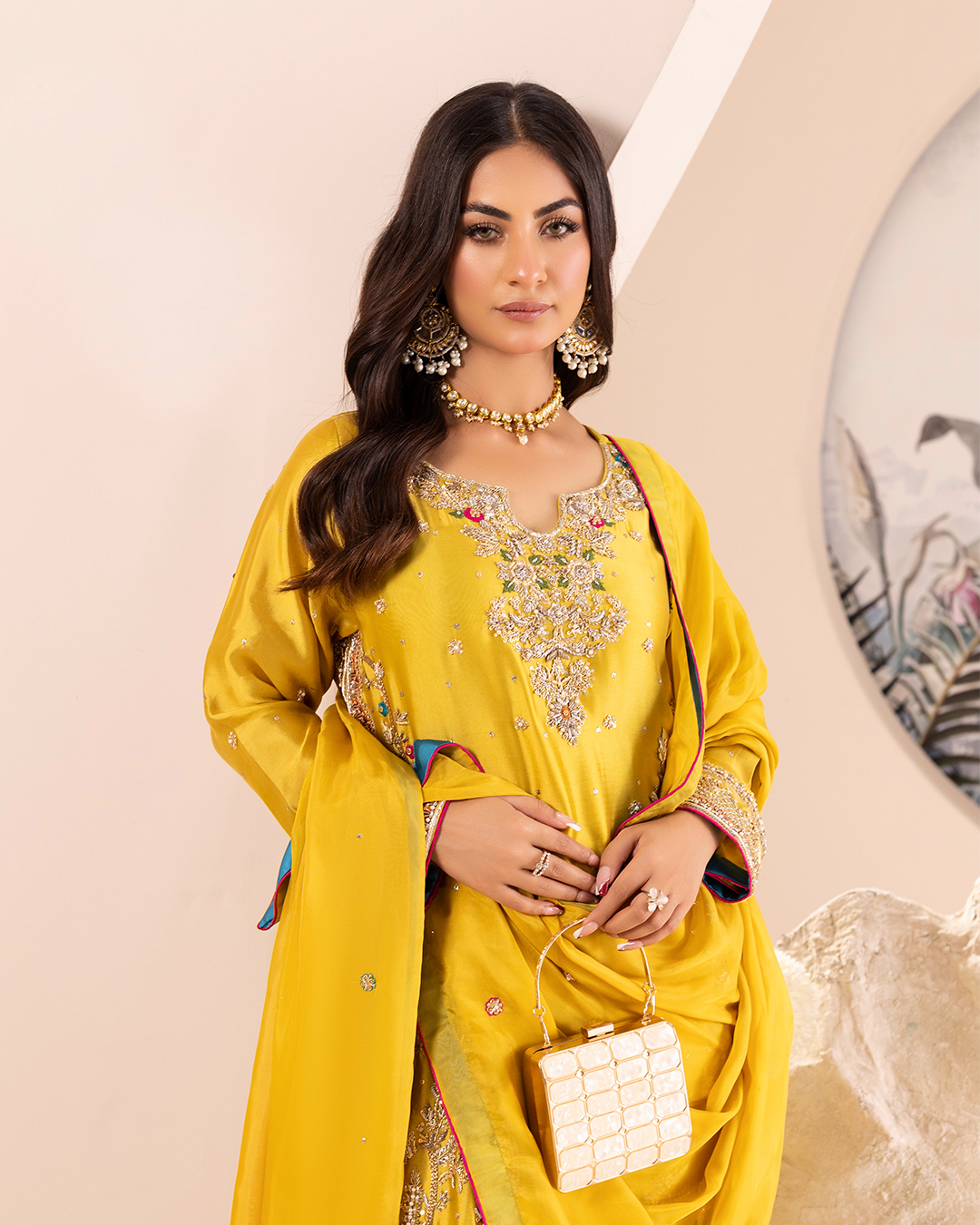 A radiant mustard yellow ensemble, Gul-e-Noor is a celebration of timeless elegance and intricate craftsmanship. The silk shirt is adorned with delicate hand-embellished gold zari, crystal, and mirror work, with vibrant resham floral motifs blooming along the hem. Paired with sleek matching trousers and a richly embellished dupatta edged in colorful piping, this outfit blends traditional charm with festive sophistication, perfect for weddings and cultural celebrations.