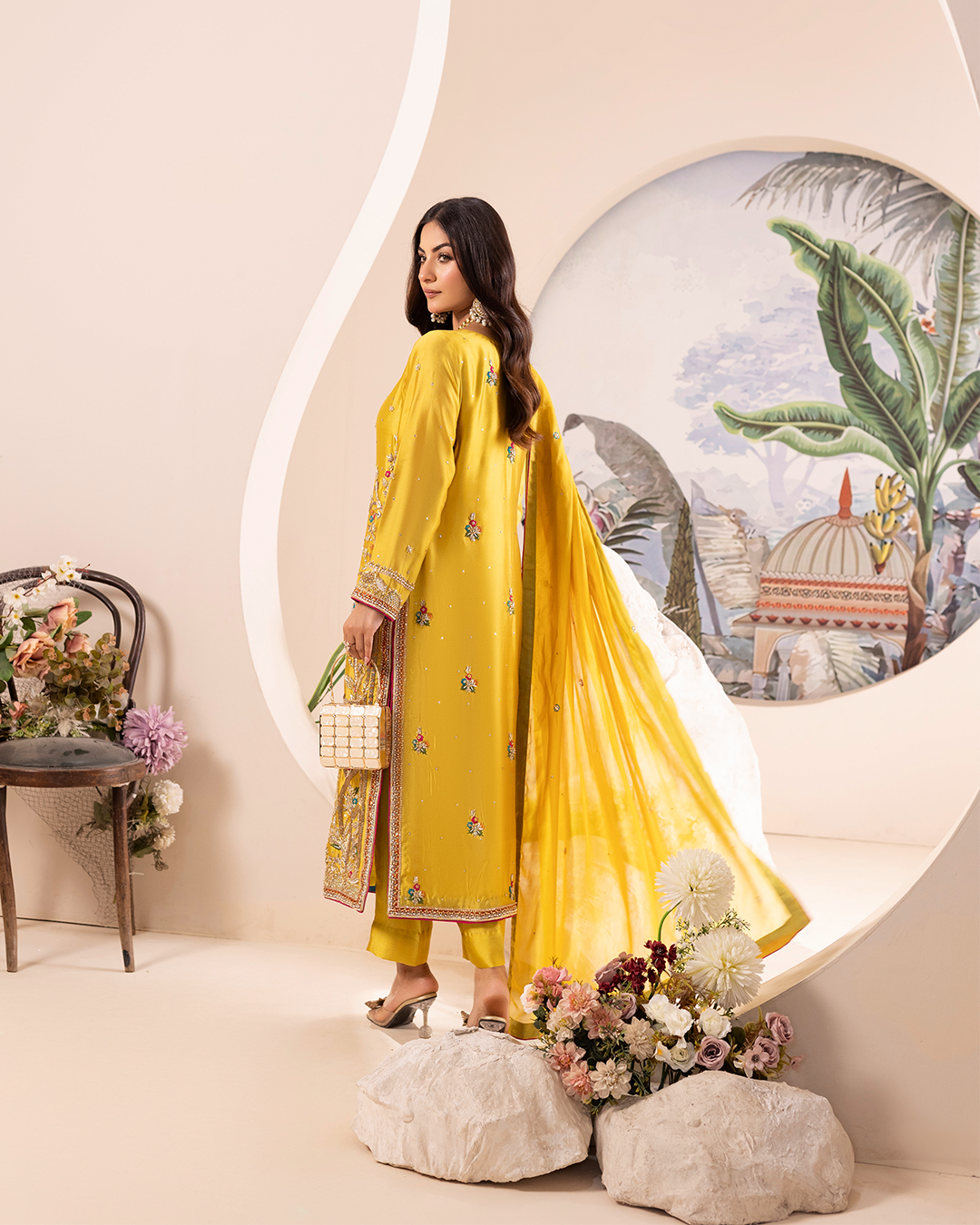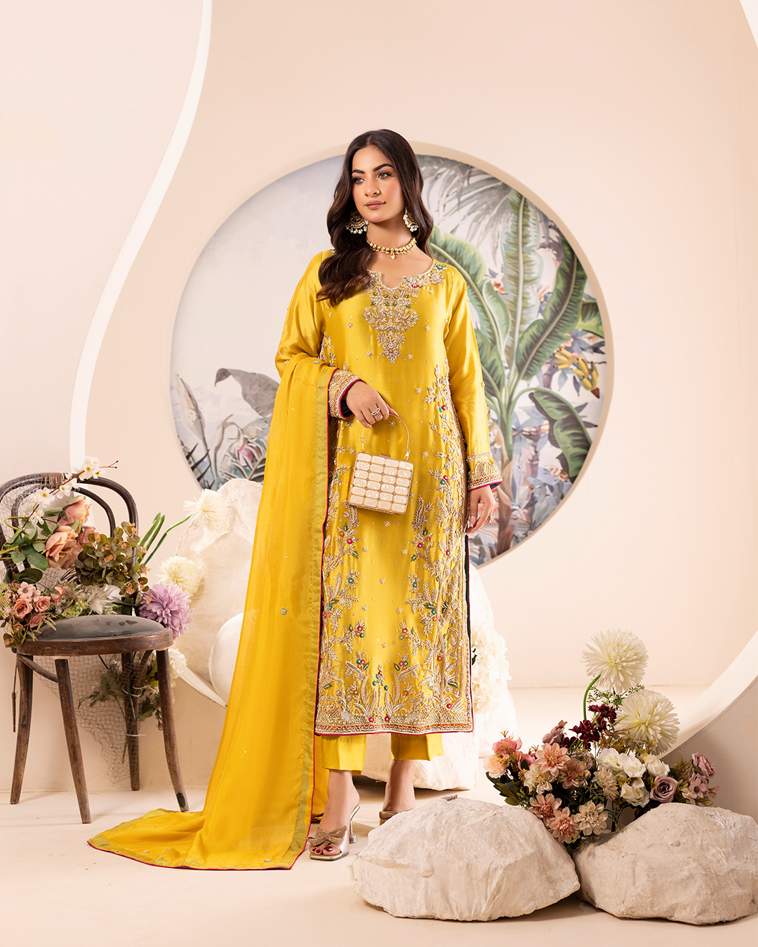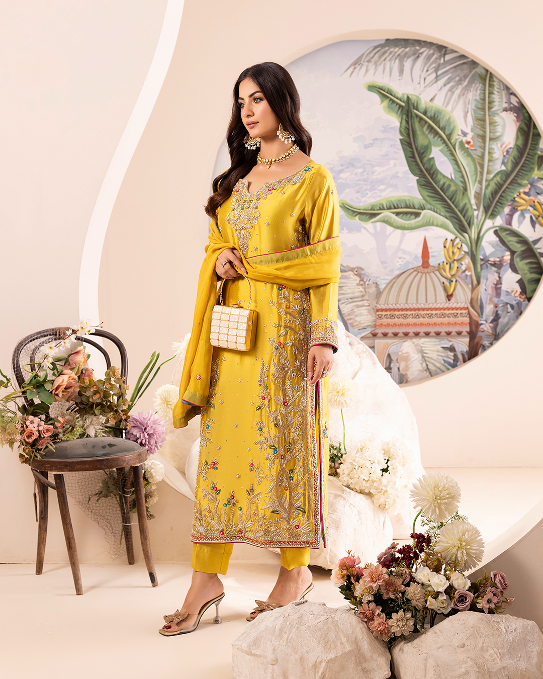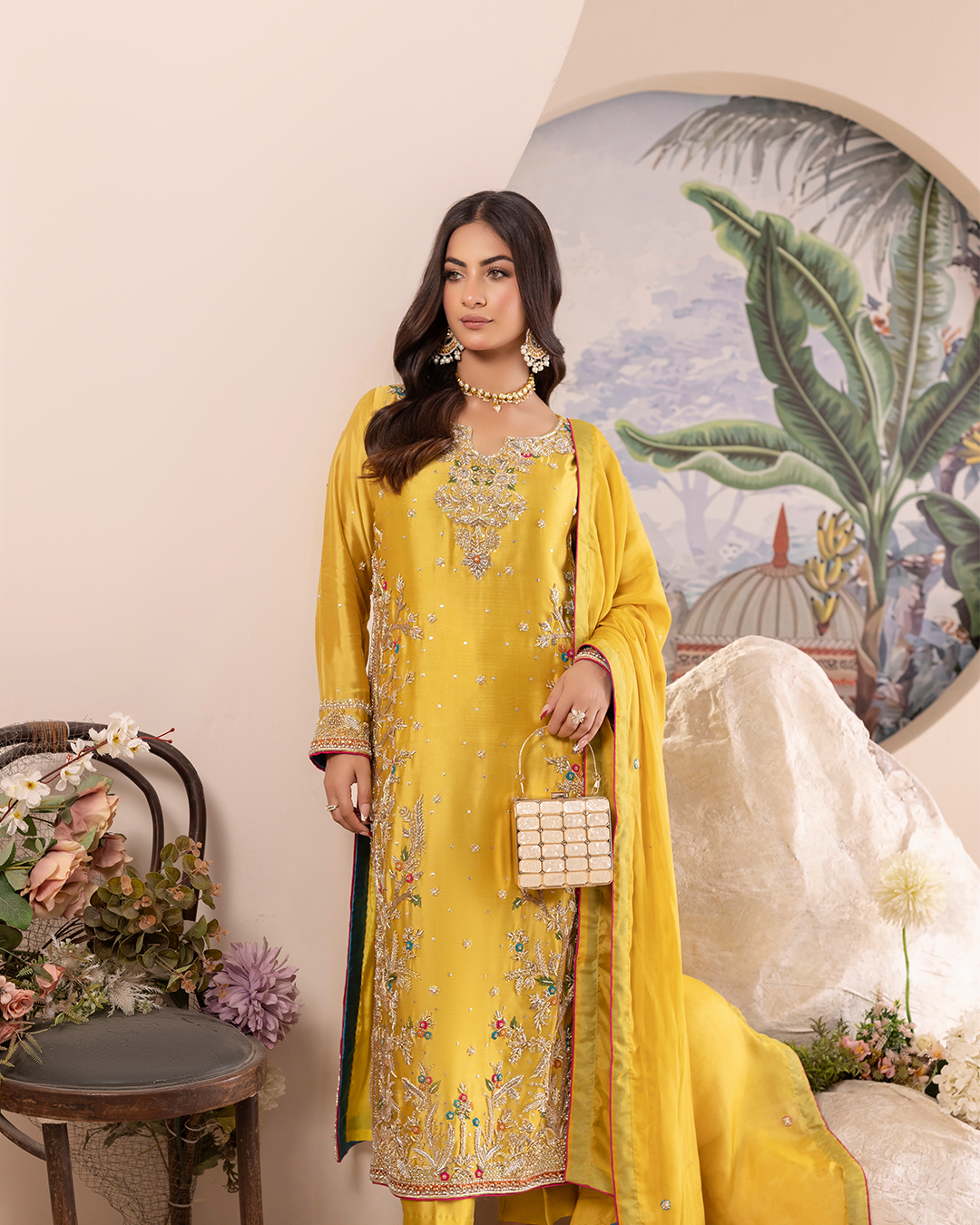 A radiant mustard yellow ensemble, Gul-e-Noor is a celebration of timeless elegance and intricate craftsmanship. The silk shirt is adorned with delicate hand-embellished gold zari, crystal, and mirror work, with vibrant resham floral motifs blooming along the hem. Paired with sleek matching trousers and a richly embellished dupatta edged in colorful piping, this outfit blends traditional charm with festive sophistication, perfect for weddings and cultural celebrations.