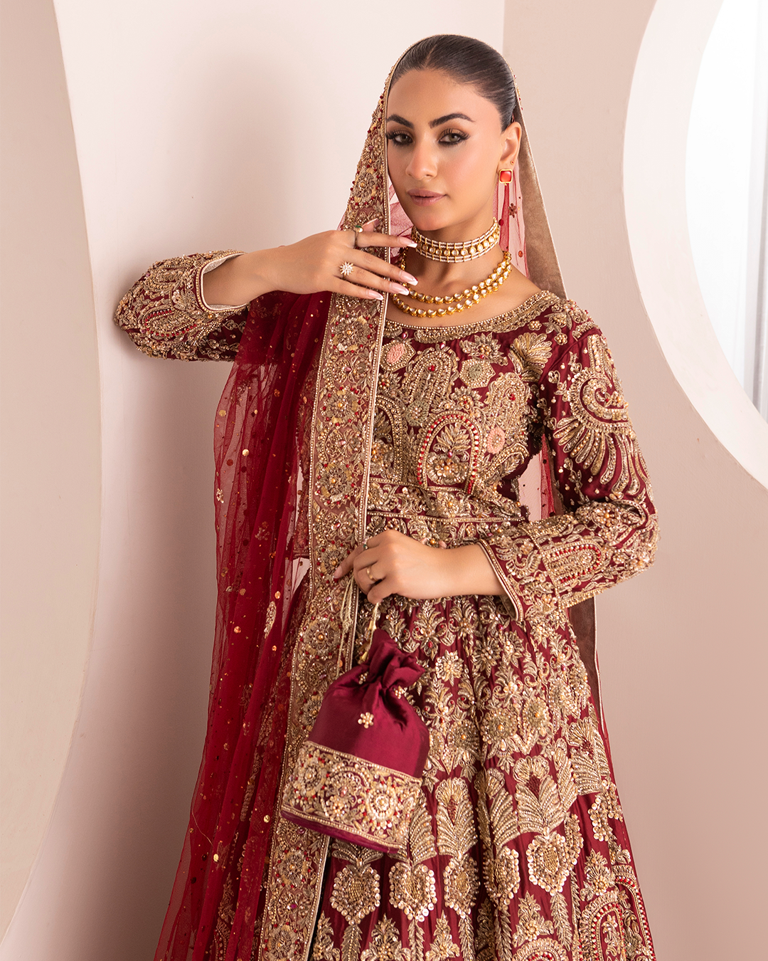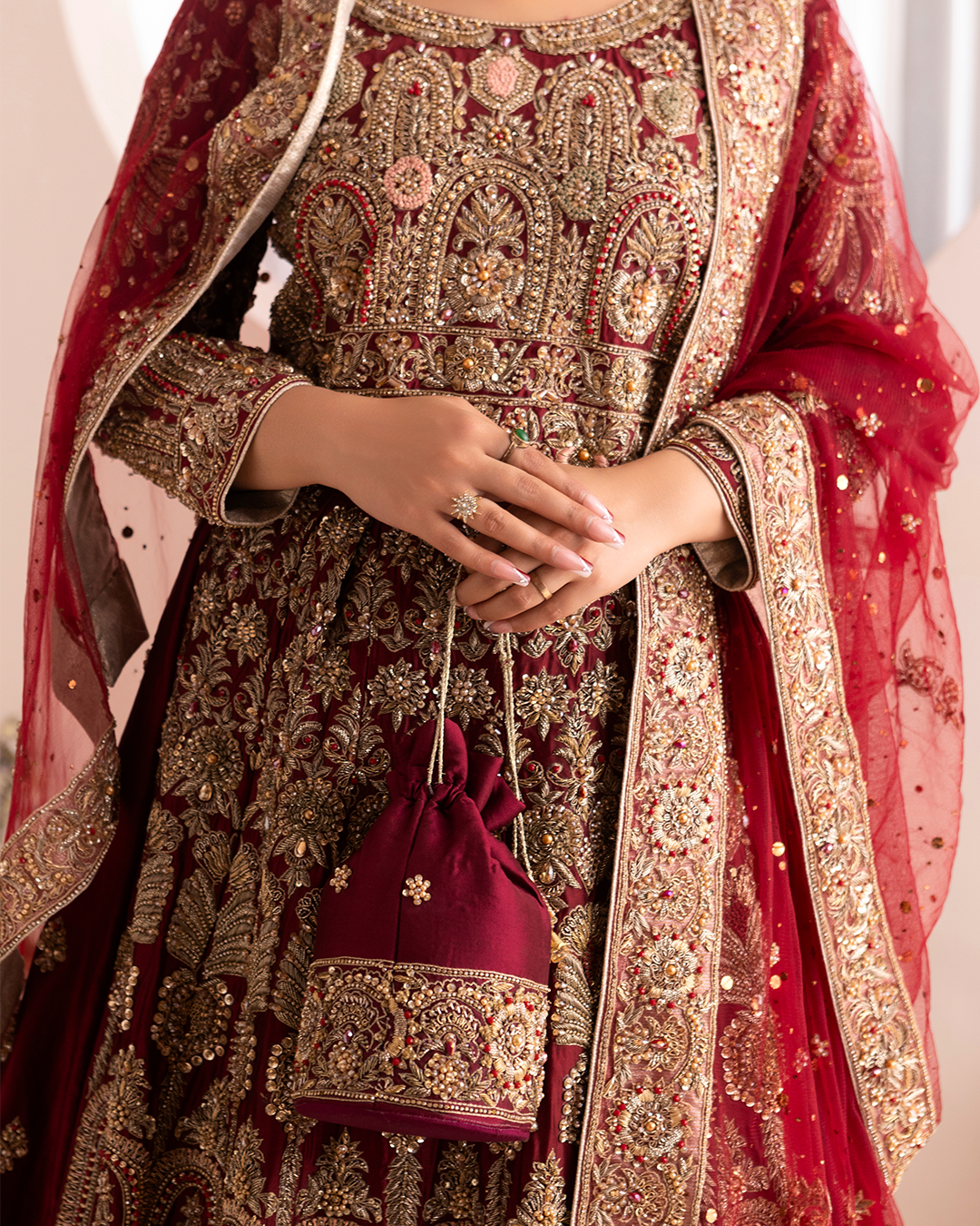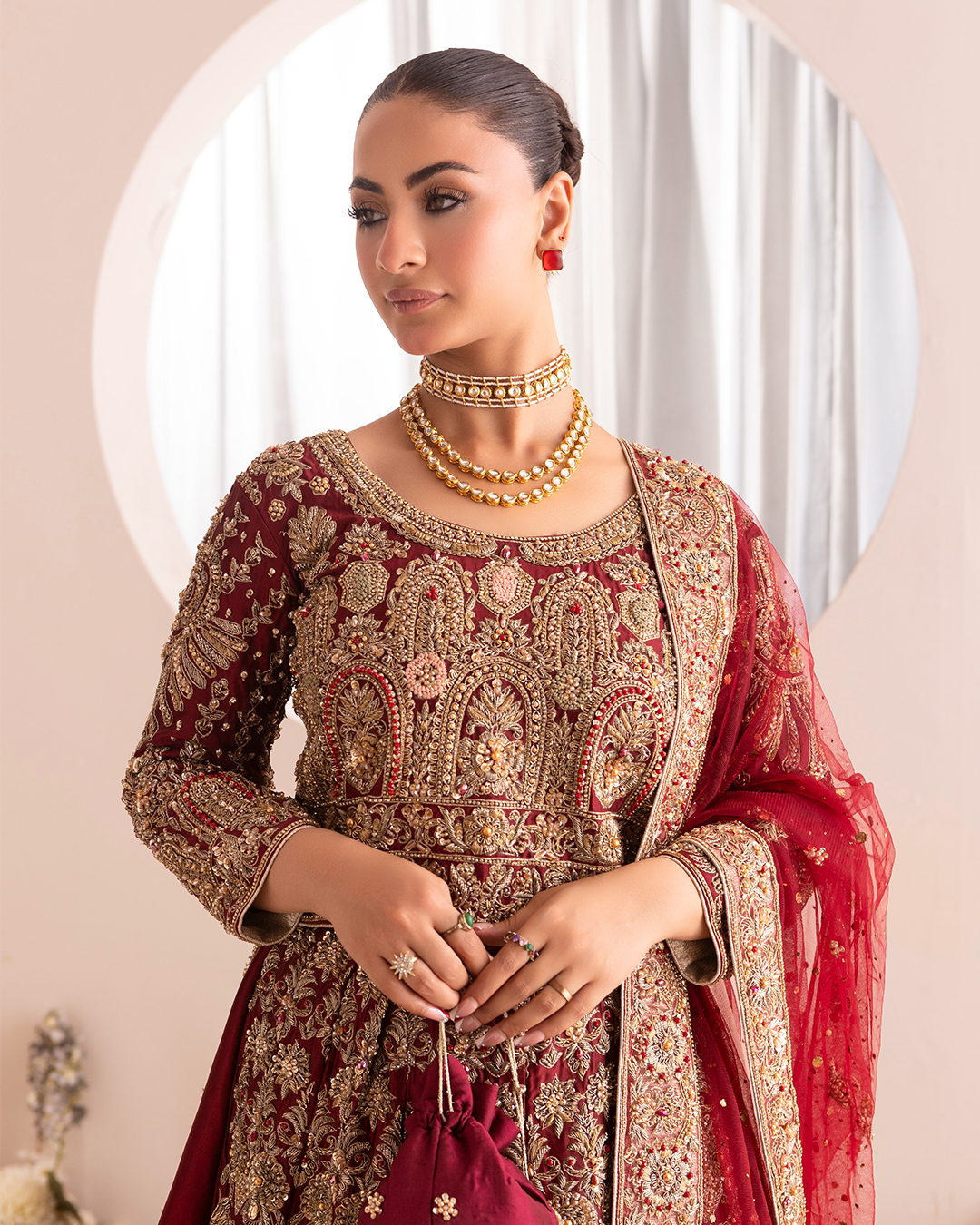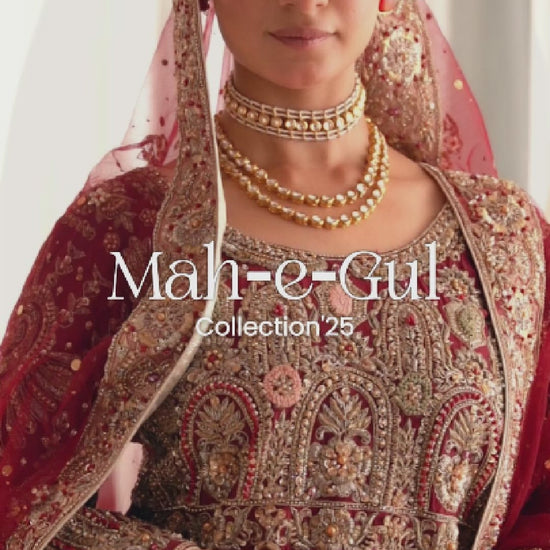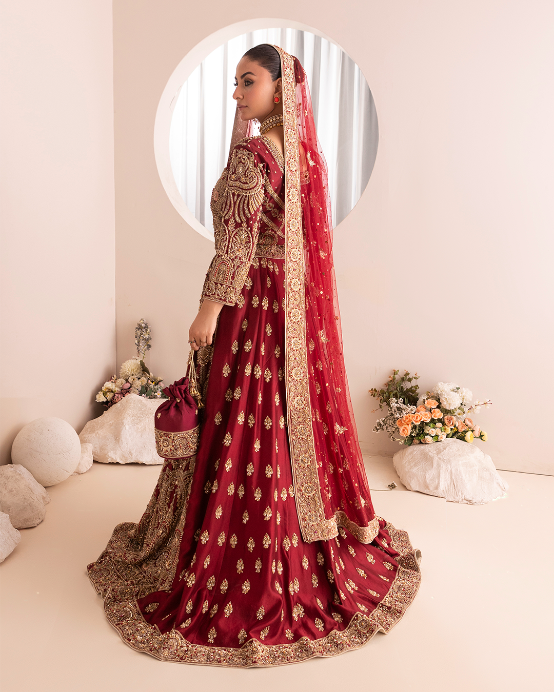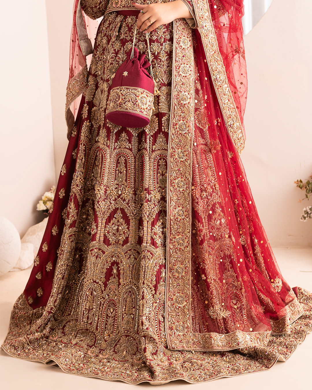 Mah-e-Gul, deep red bridal dress adorned with intricate gold zardozi, resham, and dabka embroidery, inspired by architectural arches and floral patterns. The full-sleeved boder and flared lehenga are richly detailed, while the net dupatta with scattered sequins and a scalloped border adds ethereal charm. Finished with a matching embroidered potli, this ensemble captures timeless bridal elegance.
