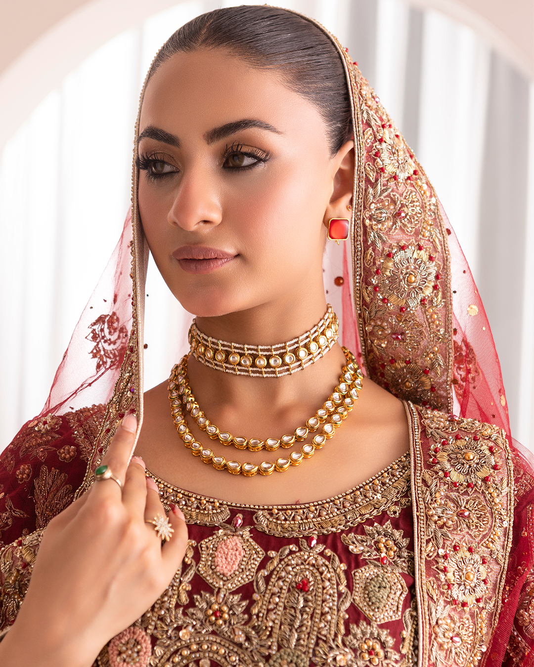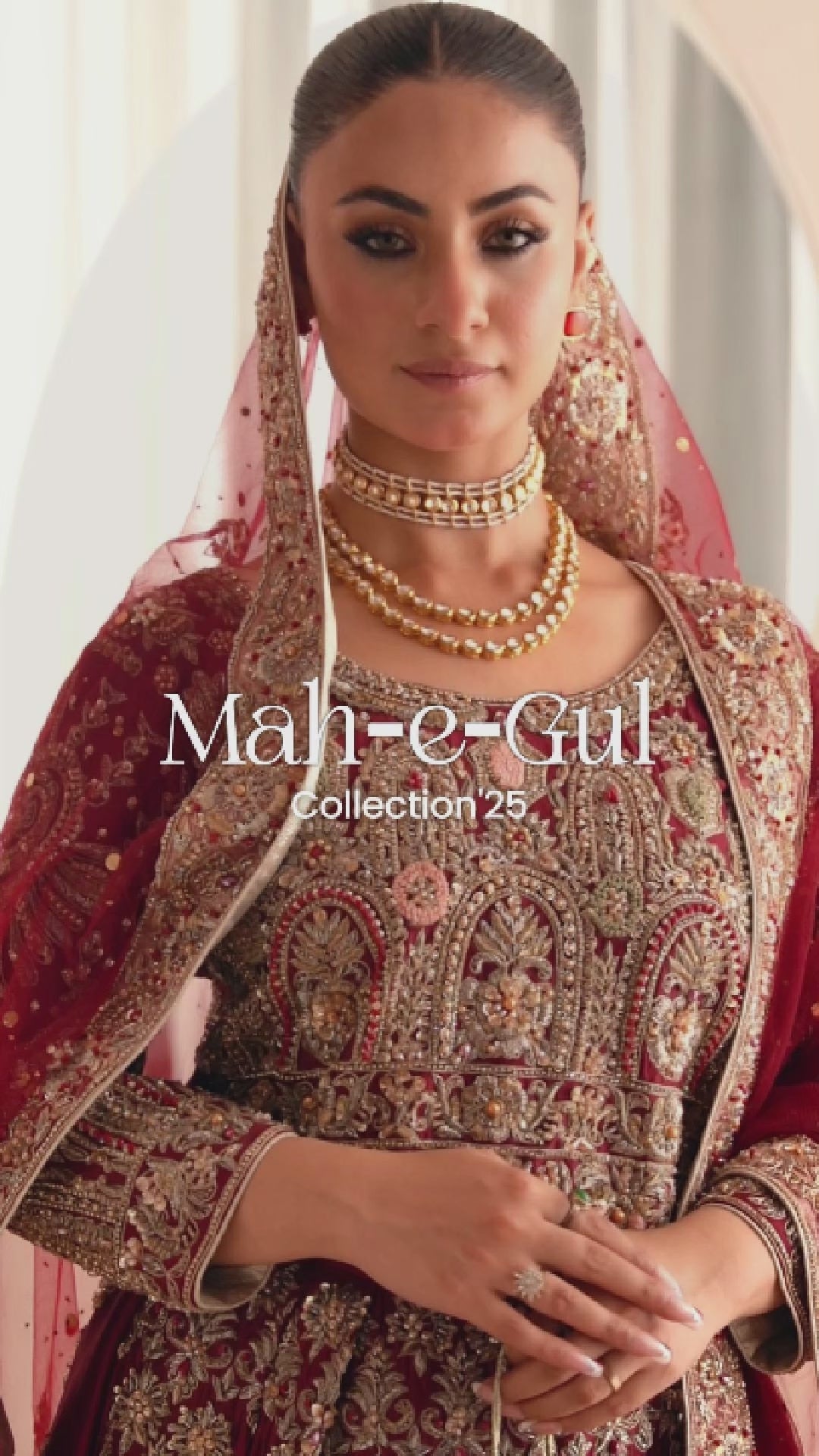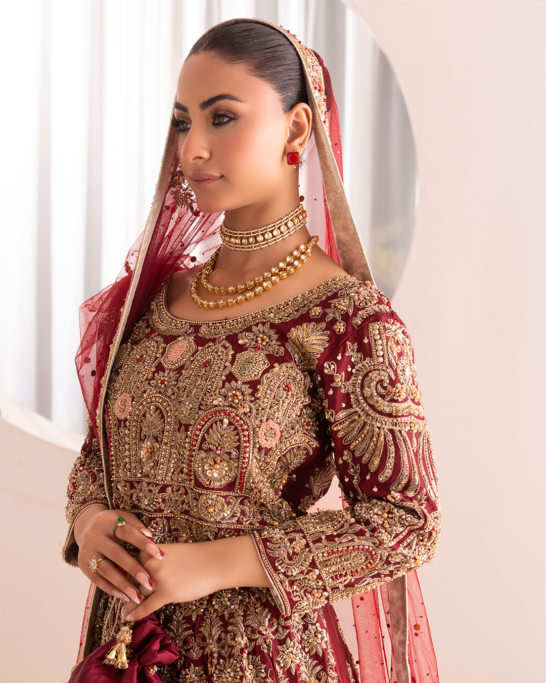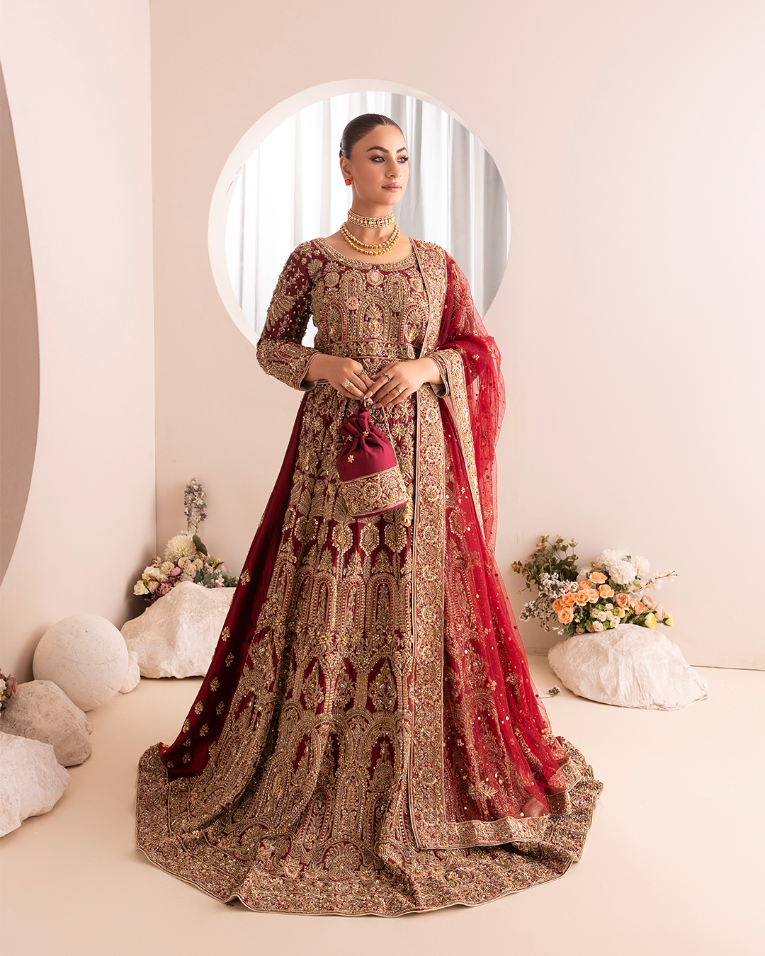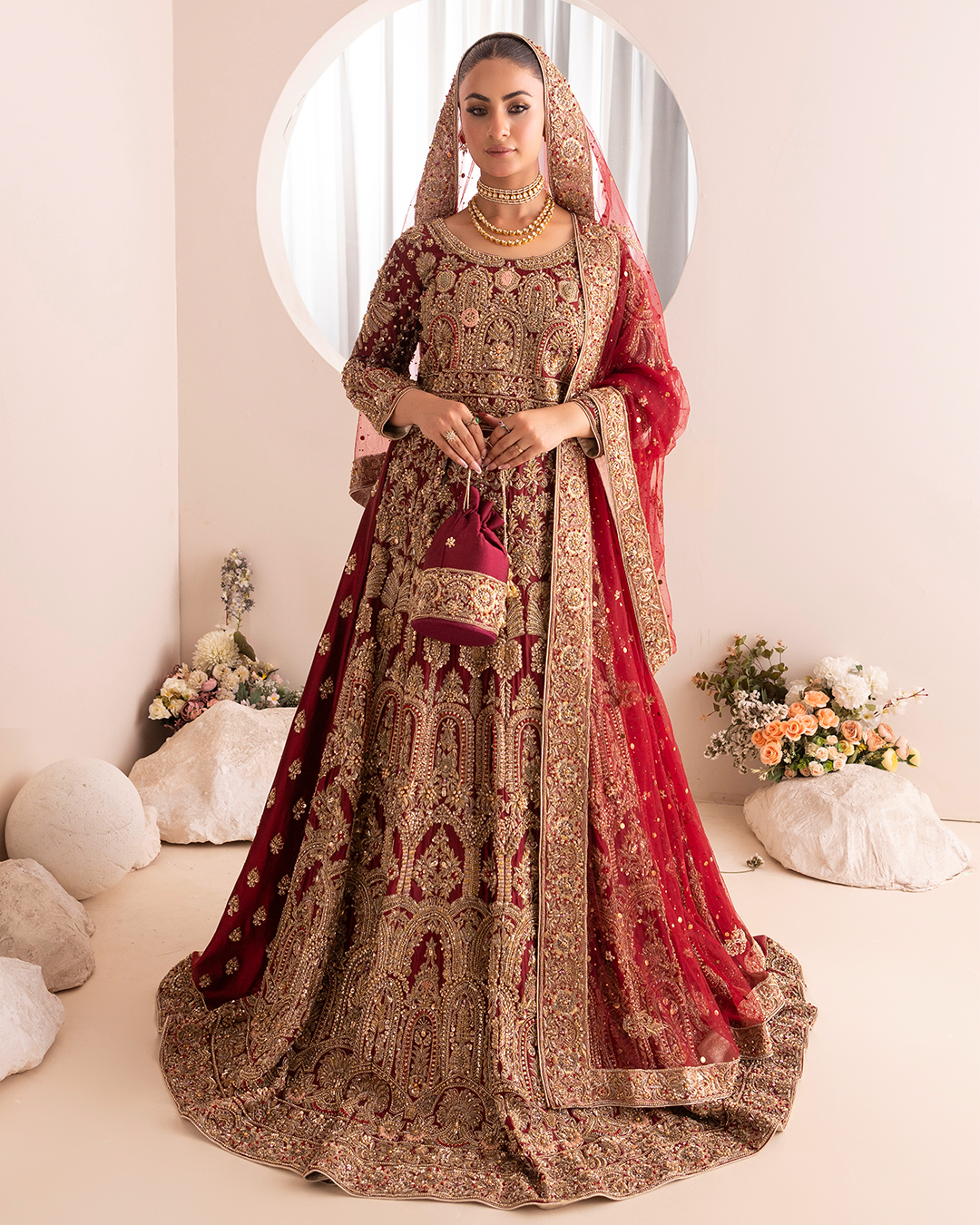 Mah-e-Gul, deep red bridal dress adorned with intricate gold zardozi, resham, and dabka embroidery, inspired by architectural arches and floral patterns. The full-sleeved boder and flared lehenga are richly detailed, while the net dupatta with scattered sequins and a scalloped border adds ethereal charm. Finished with a matching embroidered potli, this ensemble captures timeless bridal elegance.