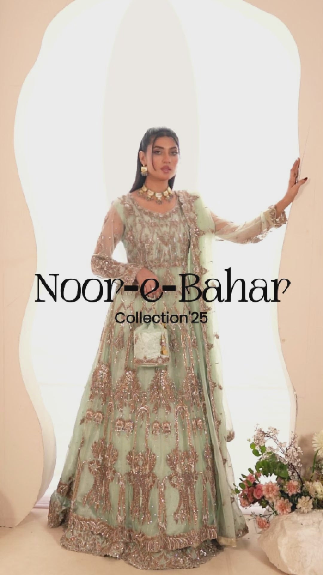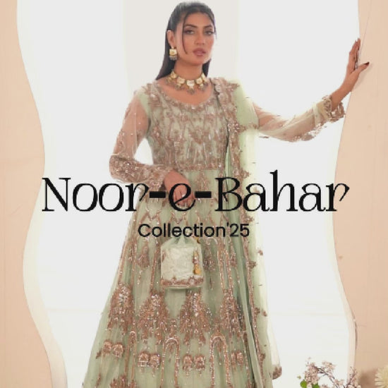 Noor-e-Bahar a dreamy ensemble in a soothing seafoam green hue, exuding delicate femininity and regal sophistication. The dress features a heavily embellished boder with a unique tapestry of antique gold zardozi, naqshi, and sequins, arranged in symmetrical motifs inspired by Mughal arches and florals. The sheer full sleeves are lightly adorned with scattered floral vines and threadwork, enhancing the subtle elegance. The flowing net dupatta is edged with a heavily embroidered scalloped border and sprinkled with fine sequin accents. Completing the look is a matching embellished potli bag, creating a cohesive and royal aesthetic. This outfit is a perfect blend of tradition and modern finesse for bridal or festive occasions.