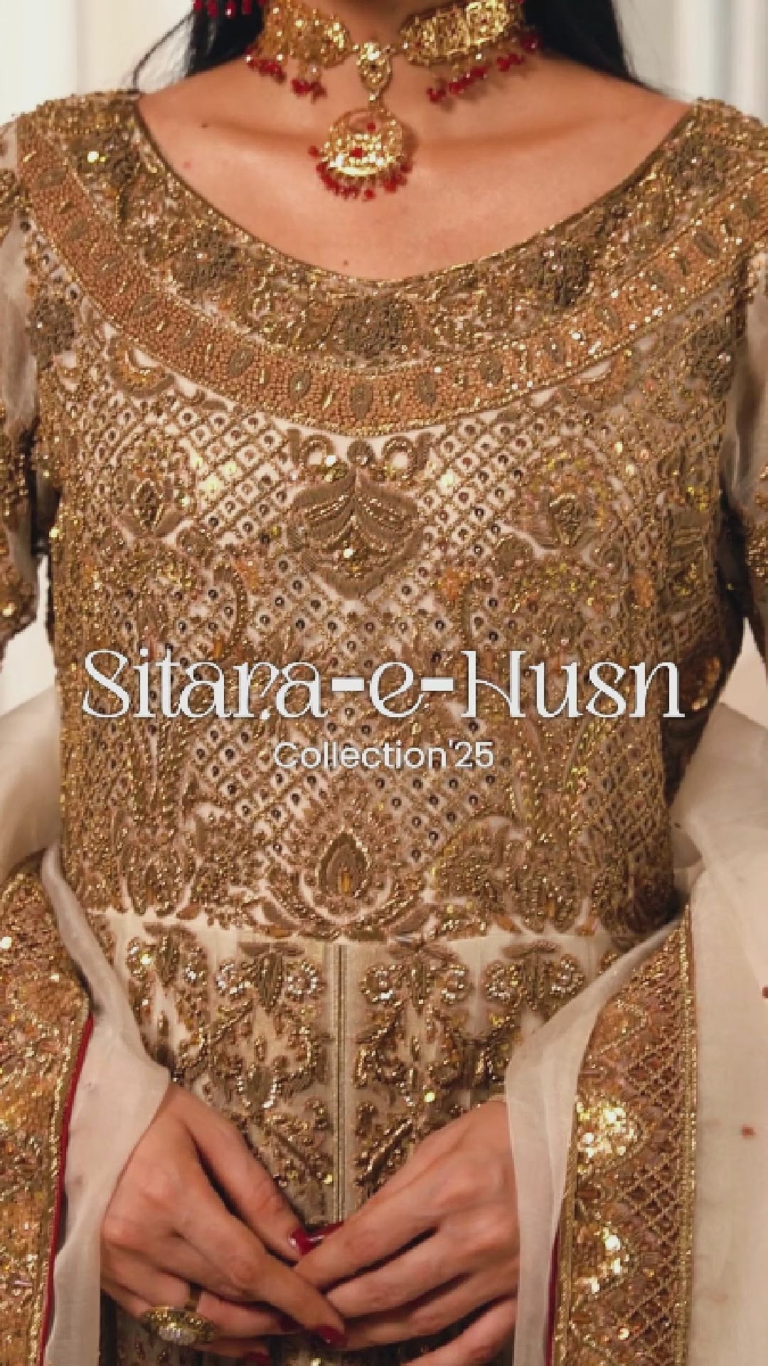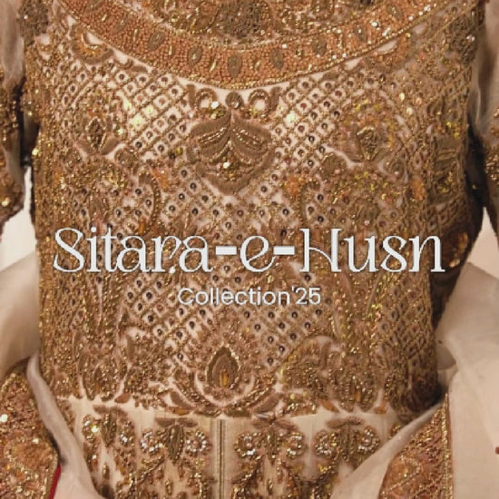 A majestic blend of tradition and elegance, Sitara-e-Husn features an ivory flared peshwas adorned with antique gold embroidery, maroon velvet floral resham work, and intricate handwork across the boder and hem. Paired with a delicately sequined dupatta edged in gold, this ensemble exudes timeless bridal charm—perfect for nikkah or walima celebrations.