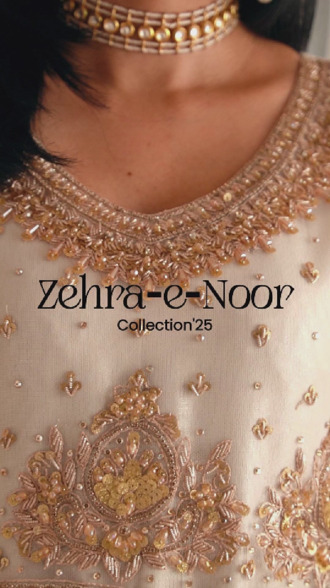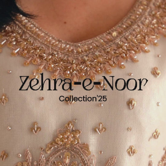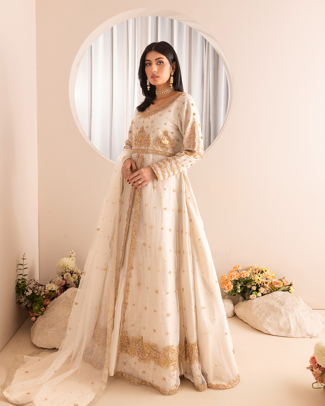 Zehra-e-Noor, An ethereal pearl white Anarkali in sheer fabric, possibly organza, flows with voluminous grace. The fitted bodice boasts intricate gold embroidery around the neckline and waist. Long, sheer sleeves finish with delicate gold cuffs. A striking central gold-embellished panel cascades down the front. The layered skirt features a rich, ornate gold hem. A matching sheer pearl white dupatta with gold borders completes this vision of refined elegance.